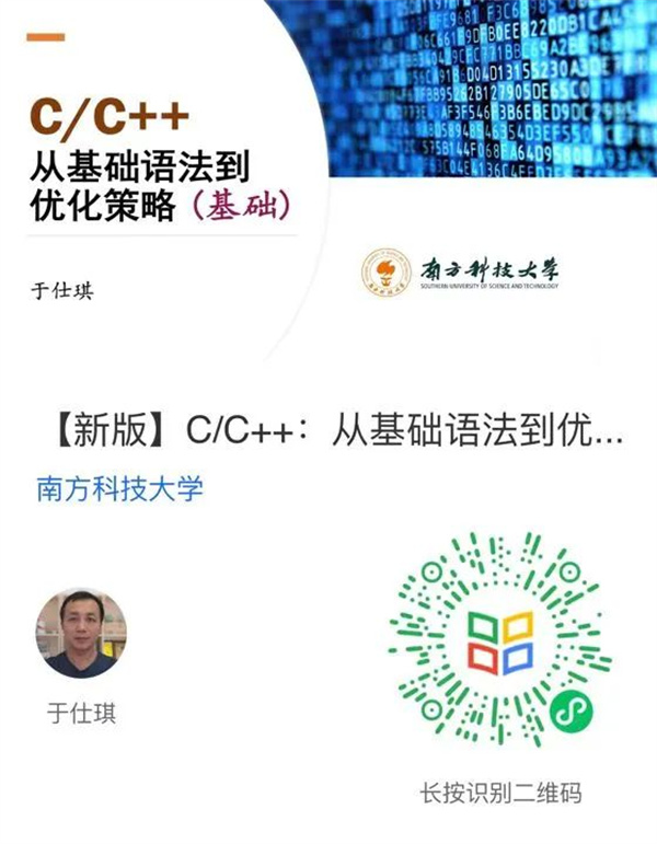 我系“C/C++:从基础语法到优化策略”网络课程第一版于2021年春季在“学堂在线”网站上线后,受到广泛欢迎。在广东省在线开放课程项目和教育部-华为“智能基座”项目支持下,升级版的在线课程“[新版]C/C++:从基础语法到优化策略”在学堂在线平台上线,此课程由于仕琪副教授主讲。