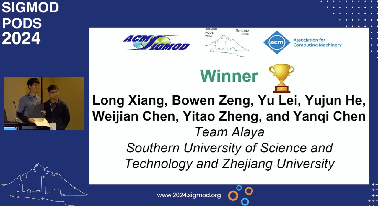 近日,数据库领域全球顶级学术会议 SIGMOD 2024在智利首都圣地亚哥落下帷幕,在本届会议举办的SIGMOD 2024的程序竞赛(ACM SIGMOD Programming Contest)中,由南方科技大学和浙江大学组成的两支联合参赛队伍Alaya 和biejuanle在南科大唐博副教授和浙江大学李环教授联合指导下从全球所有参赛队伍中脱颖而出,进入Finallist,其中Alaya队获得全球冠军,参赛队员受邀参加了SIGMOD 2024国际会议。这是南科大计算机系数据库课题组自2020年组织学生参加SIGMOD程序竞赛以来获得的第三个世界冠军。本次竞赛中,Alaya队包括南科大计算机系大二学生何俞均、郑轶涛,大四学生陈言麒,硕士研究生陈伟键和博士研究生向隆,biejuanle 队包括南科大计算机系大二学生洪朝阳、李婉婷、冯照航、梁沛然和大三学生张佳乐、王宇杰。本次竞赛的任务为在有属性约束的条件下完成向量检索索引的构建与查询,这是向量检索领域的新挑战。在该任务中,给定一千万条由微软大型自然语言表示模型图灵v5编码的100维向量数据,每条向量数据还包含一个分类属性C与一个时间戳属性T。参赛队伍需要在给定时间内对这一千万条数据建立索引并完成纯向量检索、分类属性过滤条件下的向量检索、时间戳范围过滤条件下的向量检索、同时满足分类属性与时间戳范围过滤条件的向量检索等4种检索需求。属性约束条件下的向量检索问题,在传统基于图的向量索引结构实现上面临巨大挑战。两支队伍的同学创新性地提出了一系列解决方案在时效和准确度上都达到了较高水平。尤其在准确度方面,Alaya队伍的同学尽管采用了近似算法,但其召回率接近100%,已经超出了测评系统所能评估的最小误差范围,从而以召回率突破0.9999锁定了全球第一。本次比赛共有20余支来自世界知名高校和研究机构参赛,包括德国哈索·普拉特纳研究院、慕尼黑工业大学、复旦大学、浙江大学等。ACM SIGMOD是美国计算机协会ACM下属的SIG系列学术会议,始于1970年,是国际上公认的在数据管理、数据库、数据科学方向具有最高学术地位的国际会议。每年的SIGMOD程序竞赛(ACM SIGMOD Programming Contest)题目取材于工业界所面临的各种数据管理难题,旨在促进全球各高校和科研院所的数据科学专业研究生和博士生的学术交流,提高解决实际问题的能力。南方科技大学数据库课题组由唐博副教授创建于2017年,隶属于计算机系,目前有全职教师3人,硕士博士研究生21人,研究助理20余人。课题组研究涵盖整个数据处理技术栈,包括数据库系统,数据查询处理算法,数据可视化等方向。课题组致力于推进国产数据系统和核心算法研究,成果发表在SIGMOD,VLDB,SIGIR,ICDE,EuroSys,TKDE,TPDS等顶级会议期刊上。目前,课题组和华为、阿里巴巴、字节跳动、Amazon等公司建立了长期合作关系。