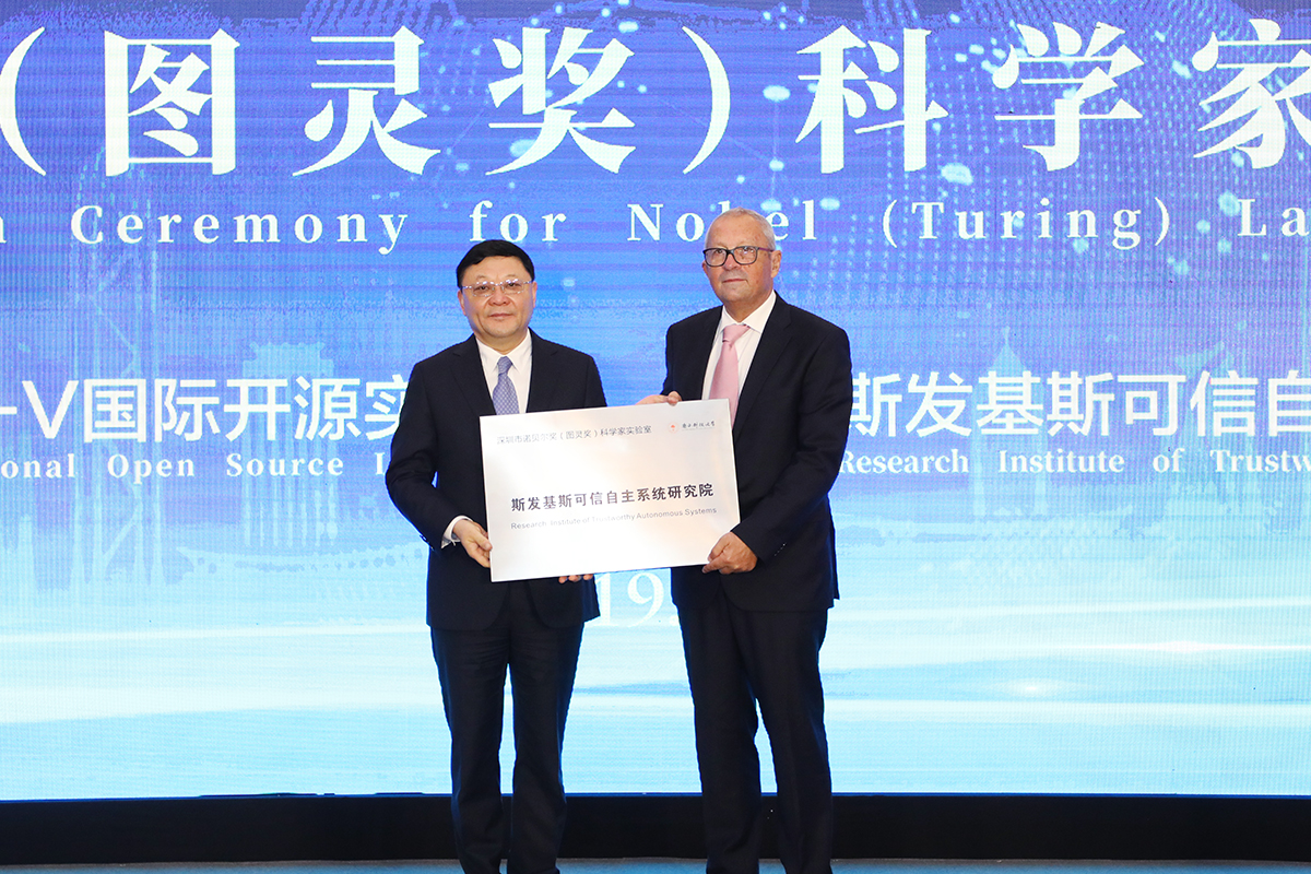 2019年11月1日,2019年“深圳人才日”聘任颁奖仪式在深圳五洲宾馆举行,南科大连续四年获深圳市“人才伯乐奖”。在颁奖仪式上,图灵奖得主Joseph Sifakis依托南科大成立的斯发基斯可信自主系统研究院正式获得授牌。深圳市委书记王伟中、市长陈如桂、市人大常委会主任骆文智等市领导以及深圳市高层次人才代表出席活动。南方科技大学校长、中国科学院院士陈十一,长期访问杰出教授、图灵奖得主Joseph Sifakis,物理系讲席教授、中国科学院院士、量子科学与工程研究院院长俞大鹏,数学系讲席教授、中国科学院院士方复全,计算机科学与工程系主任姚新,电子与电气工程系讲席教授王太宏等参加活动。王伟中为斯发基斯可信自主系统研究院授牌王伟中为斯发基斯可信自主系统研究院授牌,这是活动现场被授牌的两所实验室之一,Joseph Sifakis作为研究院代表接受授牌。Joseph Sifakis现任南科大杰出教授,为法国科学院院士、法国国家工程院院士、欧洲科学院院士、美国艺术与科学学院院士及美国国家工程院院士。Joseph Sifakis长期从事严密系统工程、信息物理系统、形式化方法等相关领域研究,取得了诸多原创性、开创性成果。Joseph Sifakis创立了模型检测理论与方法,并将其成功应用于工业界的实时系统安全性验证,于2007年获计算机领域最负盛名、最崇高的奖项“图灵奖”。 斯发基斯可信自主系统研究院是由Joseph Sifakis牵头组建的可信智能自主系统研究机构,研究领域覆盖计算智能、可信软件、自动驾驶、智慧城市和智慧医疗等重点前沿方向,将依托南科大计算机科学与工程系、深圳市计算智能重点实验室,开展新一代人工智能前沿技术研究,为培养后备科技人才、推进深圳产业升级、助力深圳建设中国特色社会主义先行示范区建设贡献力量。此外,研究院拟引进一批相关领域的国际知名学者,形成以图灵奖科学家、院士和IEEE Fellow等知名学者为研究主导,中青年教师为学科带头人,青年科技骨干为主体的人才队伍。